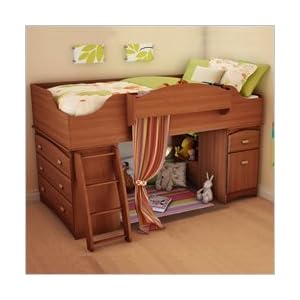 The drawers and cabinet can be placed on either end to best fit your room's layout. There is storage aplenty here. The three drawers seem a little shallow, but are so wide they make up for it. The toy box with shelf and storage cabinet side are great as well. The cabinet is deep since it goes back half the width of the bed. For the time we've left off the door on the cabinet and have placed bins inside. We especially like the bedside cubby, which replaces a nightstand. The area under the bed is a great little play area for my daughter. She's set up house for her dolls. You will need a 36" curtain rod if you're copying the photograph. For light underneath we installed a small fluorescent light bar, screwed into the bottom of the bed frame. I can imagine a bean bag under there for hanging out when she's older.